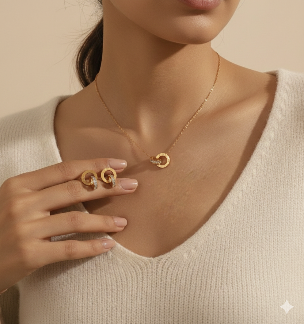 A beautifully coordinated pendant necklace and drop earring set designed to add effortless elegance to any look. The pendant necklace features a refined, eye-catching charm that rests delicately on the neckline, catching the light with every movement. Paired with matching drop earrings, this set creates a graceful and timeless silhouette that enhances both everyday outfits and special occasion wear.